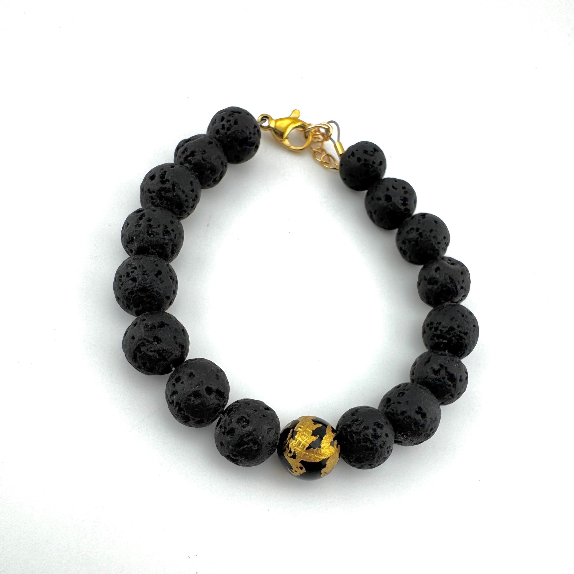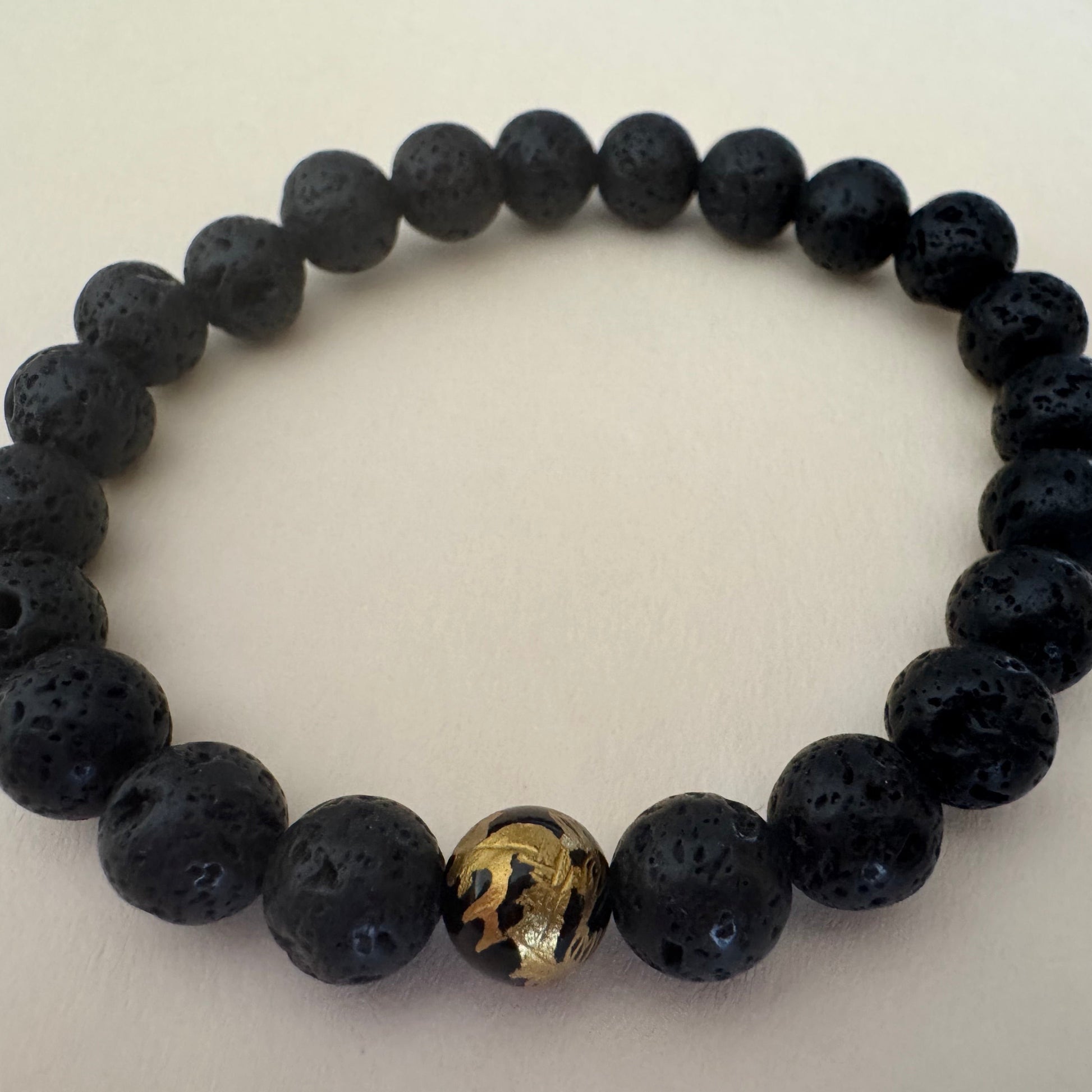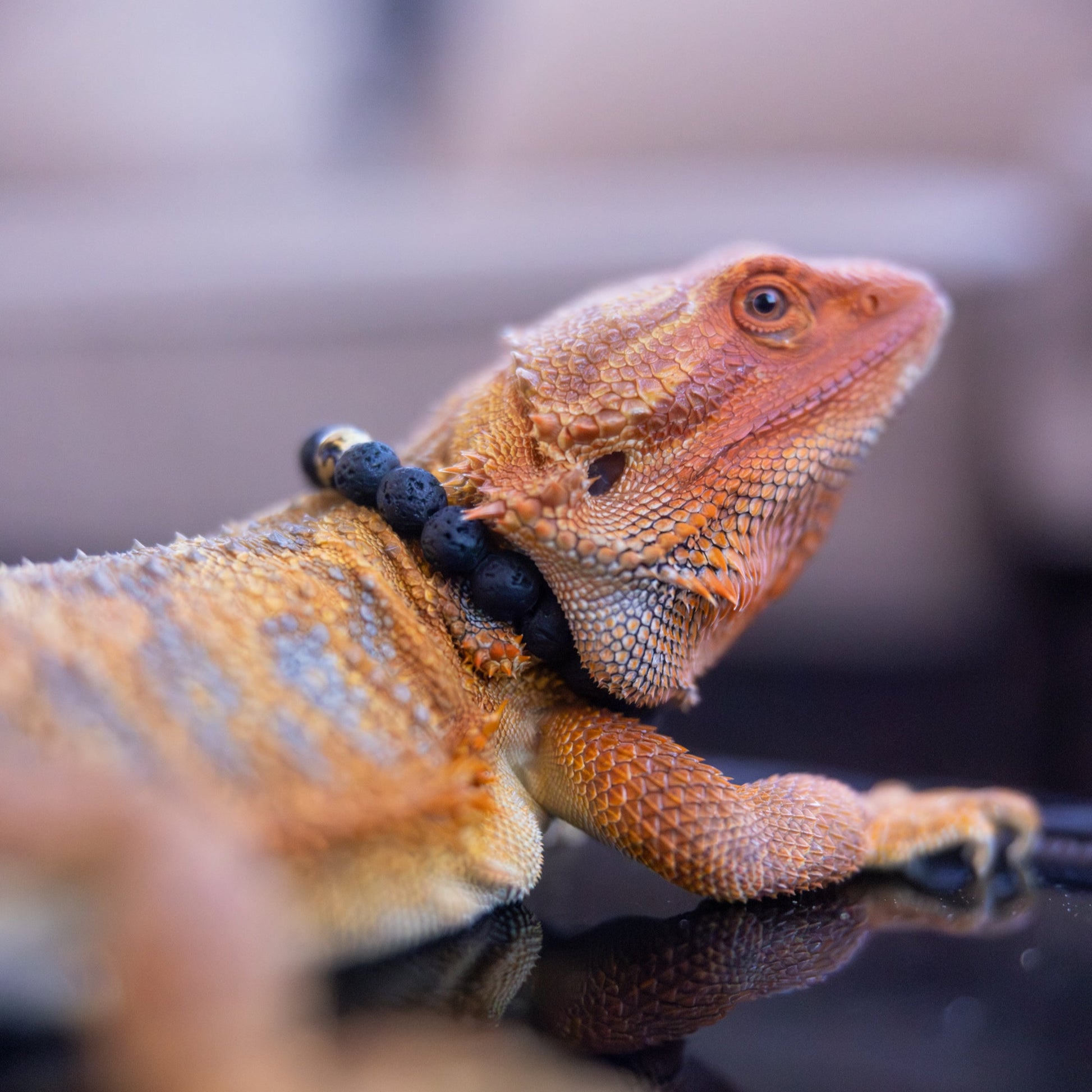 Raja, with a neck size of 5.75", sports an 8mm lava bead necklace adorned with a painted dragon bead, designed especially for bigger dragons.
