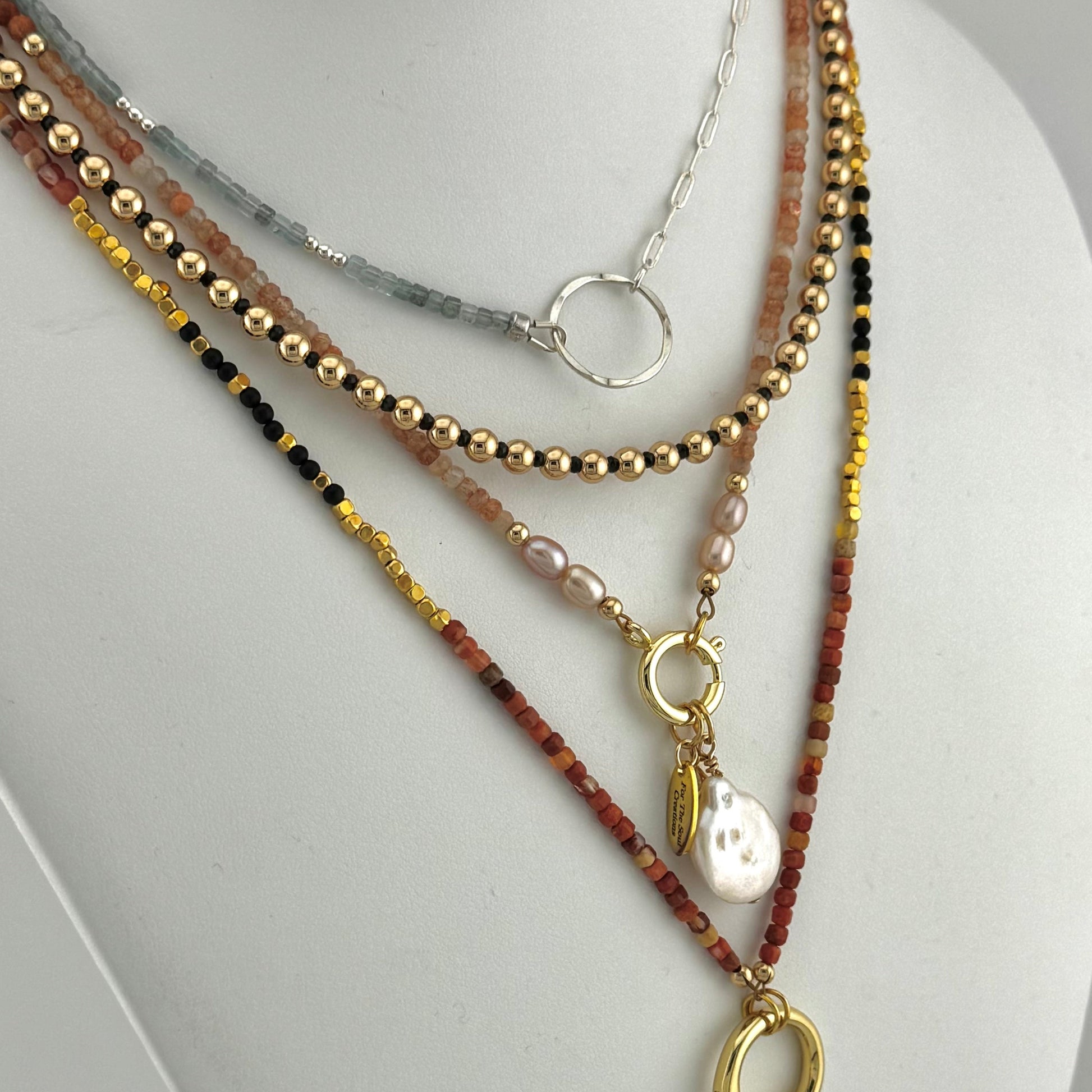 - Sunstone Gems, Gold-filled beads, and pearls with charm clasp 16"