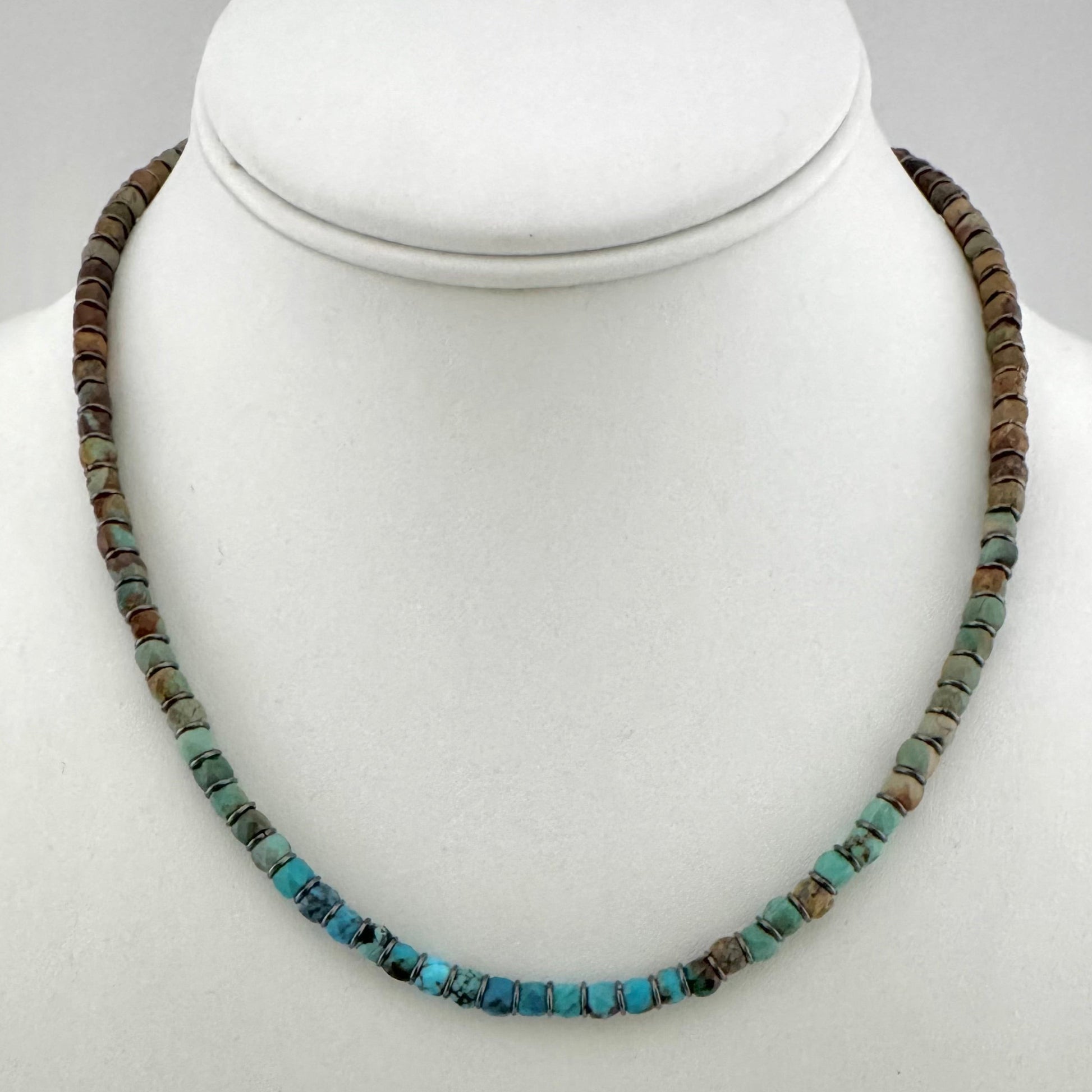 This stunning necklace features natural, multicolored genuine turquoise beads, each faceted and cut into delicate 4mm cubes. The colors fade beautifully in an ombre style, highlighted by sleek gunmetal spacers that make the vibrant hues pop and add extra charm to this unique accessory.