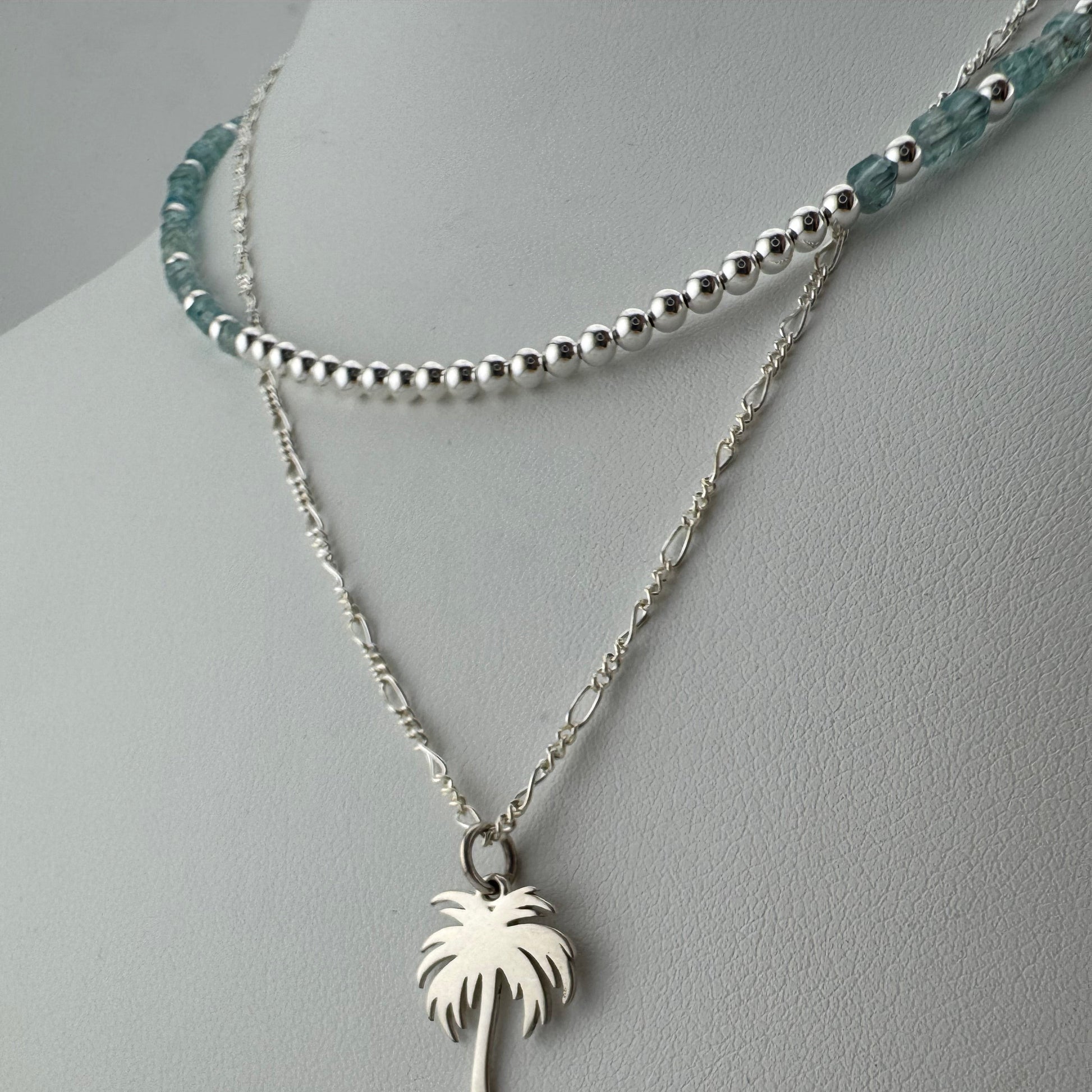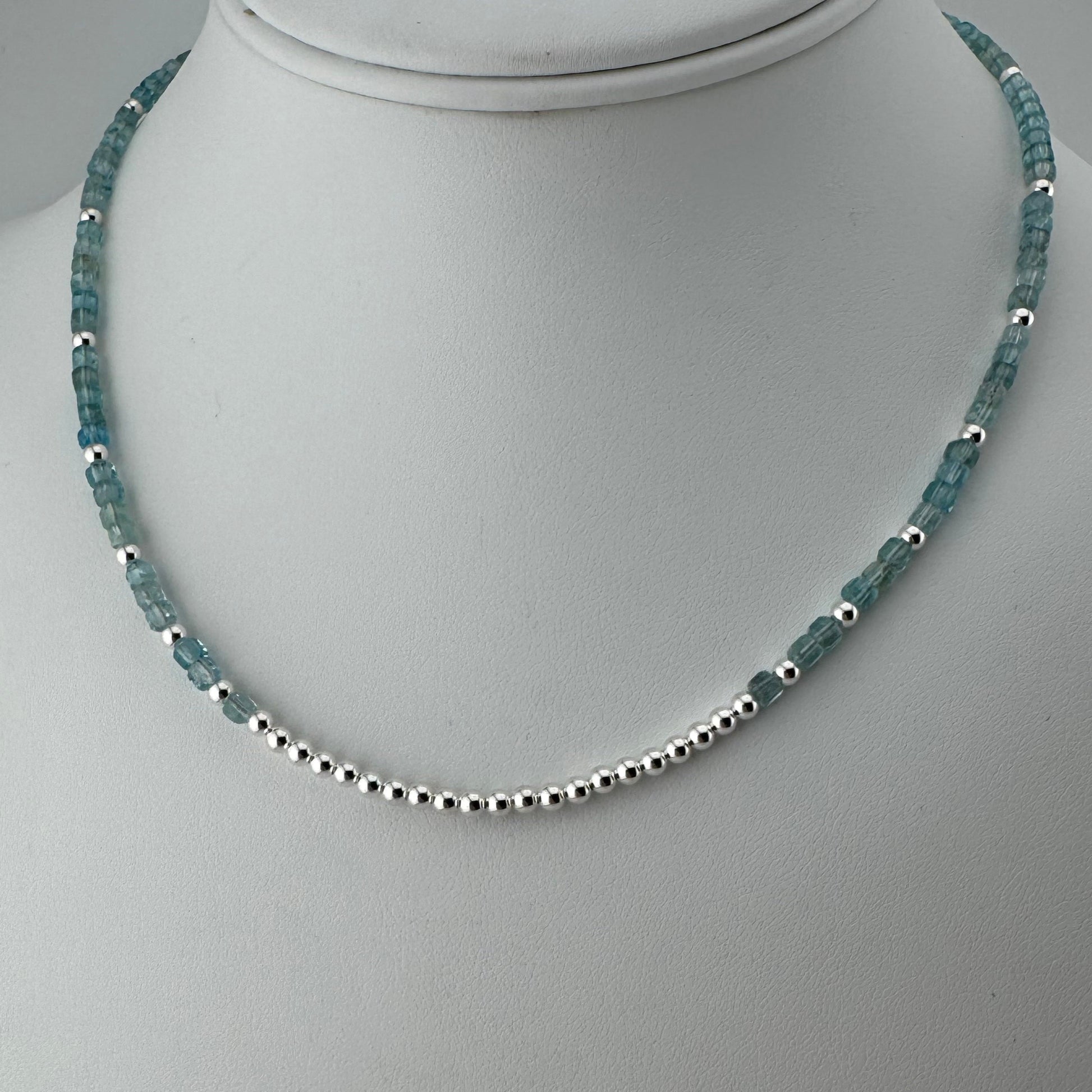 This charming necklace features tiny 3mm cubed blue apatite stones in a light teal shade, paired with sterling silver beads. It measures 16.75" and closes with a handy magnetic clasp for easy wear.